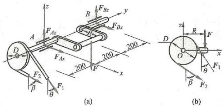 例 6 在图 23a 中,带的拉力 {F}_{2} = 2{F}_{1} ,曲柄上作用有铅垂力 F = {2000}\mathrm{\;N} 。带轮的直径 D = {400}\mathrm{\;{mm}} ,曲柄长 R = {300}\mathrm{\;{mm}} ,带 1 和带 2 与铅垂线间夹角分别为 \theta = {30}^{ \circ },\beta = {60}^{ \circ } (图 23b), 其他尺寸如图所示。求带的拉力和轴承约束力。
