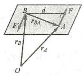 由图 4 可见,以 r 表示力作用点 A 的矢径,则矢积 \mathbf{r} \times \mathbf{F} 的模等于力矩的大小,由右手螺旋法则,力矩的转向与 \mathbf{r} \times \mathbf{F} 一致, 而 \mathbf{r} \times \mathbf{F} 所在直线则决定了力矩作用面的方位。因此可得
