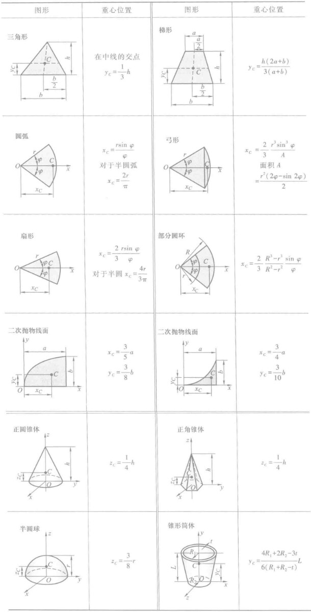 在实际应用中, 许多物体重心的位置可从工程手册上查到, 工程中常用的型钢 (如工字钢、角钢、槽钢等)截面的重(形)心,也可以从型钢规格表中查到。表 2 列出了几种常见的简单均质几何形体及其重心位置。