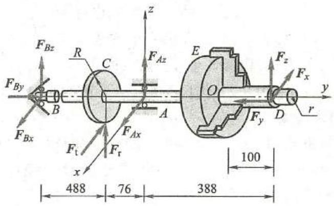 例 7 车床主轴如图 24 所示,已知车刀对工件的径向切削力 {F}_{x} = {4.25}\mathrm{{kN}} ,纵向切削力 {F}_{y} = {6.8}\mathrm{{kN}} ,主切削力 (切向) {F}_{z} = {17}\mathrm{{kN}} ,方向如图所示。 {F}_{1} 与 {F}_{\tau } 分别为作用在直齿轮 C 上的切向力和径向力,且 {F}_{\mathrm{r}} = {0.36}{F}_{1} 。齿轮 C 的节圆半径 R = {50}\mathrm{\;{mm}} ,被切削工件的半径 r = {30}\mathrm{\;{mm}} 。不考虑卡盘和工件等的自重,其余尺寸如图所示。系统处于平衡状态。求: (1) 齿轮啮合力 {\mathbf{F}}_{1} 与 {F}_{t} ; (2) 径向轴承 A 和止推轴承 B 的约束力; (3) 三爪卡盘 E 在 O 处对工件的约束力。 解:先取整体为研究对象,受力如图 24 所示,为一空间任意力系,选坐标系如图所示。 (1)求齿轮啮合力 {F}_{1} 与 {F}_{r} ,列平衡方程: