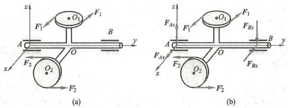 例 4 如图 14a 所示,不计各构件的自重,圆盘 {O}_{1} 与 {O}_{2} 分别和水平轴 {AB} 固连, {AB} = {800}\mathrm{\;{mm}},{O}_{1} 盘面垂直于 z 轴, {O}_{2} 盘面垂直于 x 轴,盘面上分别作用有力偶 \left( {{F}_{1},{F}_{1}^{\prime }}\right) 与 \left( {{F}_{2},{F}_{2}^{\prime }}\right) 。 两圆盘半径均为 {200}\mathrm{\;{mm}},{F}_{1} = {30}\mathrm{\;N},{F}_{2} = {50}\mathrm{\;N} 。求轴承 A 和 B 处的约束力。