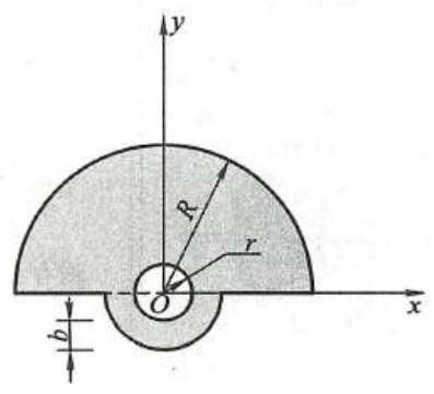 解: 将偏心块看成是由三部分组成,即半径为 R 的半圆,半径为 r + b 的半圆和半径为 r 的小圆。因为半径为 r 的小圆是切去的部分, 所以面积应取负值。建立坐标系如图所示,则有 {x}_{c} = 0 。设 {y}_{1}\text{、}{y}_{2}\text{、}{y}_{3} 分别是三部分重心的坐标,查表 2 ,可知