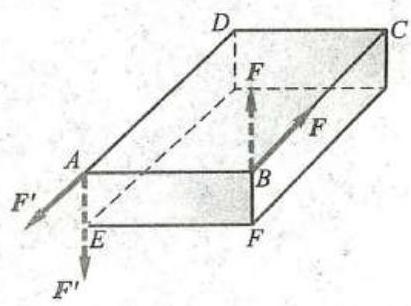 和空间中力对点的矩类似,在空间中,力偶对物体的作用效果还与力偶的作用面有关。图 8 所示为一长方体,同一个力偶作用在平面 {ABCD} 内和平面 {ABFE} 内, 显然, 力偶对物体的作用效果不同, 这是由于力偶作用面不同所致。在这种情况下, 力偶对物体的作用效果取决于三个要素: