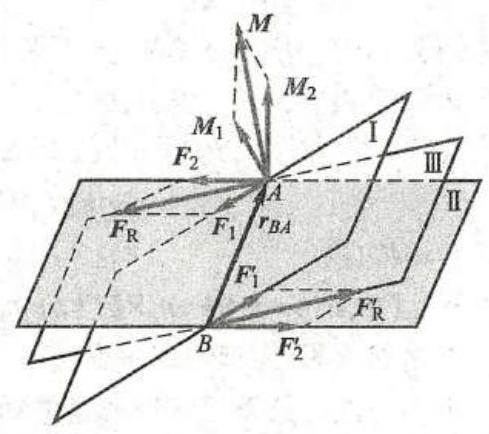 再分别合成 A\text{、}B 两点的汇交力,得 {\mathbf{F}}_{\mathrm{R}} = {\mathbf{F}}_{1} + {\mathbf{F}}_{2},{\mathbf{F}}_{\mathrm{R}}^{\prime } = {\mathbf{F}}_{1}^{\prime } + {\mathbf{F}}_{2}^{\prime } 。显然,力 {\mathbf{F}}_{\mathrm{R}} 与力 {\mathbf{F}}_{\mathrm{R}}^{\prime } 等值、反向、平行且不共线,形成一个力偶,它作用在平面 \mathrm{{II}} 内,令其力偶矩矢为 M ,从图 13 可见
