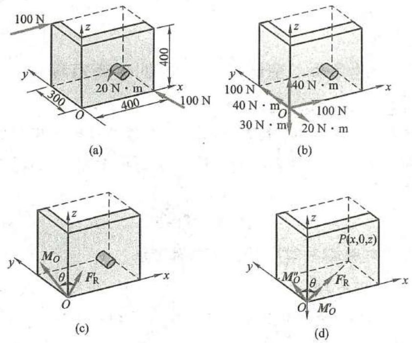 {\mathbf{M}}_{o}^{\prime \prime } = \mathbf{r} \times {\mathbf{F}}_{\mathrm{R}}^{\prime } = \left| \begin{matrix} \mathbf{i} & \mathbf{j} & \mathbf{k} \\ x & 0 & z \\ {100}\mathrm{\;N} & {100}\mathrm{\;N} & 0 \end{matrix}\right| = - {100}\mathrm{\;N} \cdot z\mathbf{i} + {100}\mathrm{\;N} \cdot z\mathbf{j} + {100}\mathrm{\;N} \cdot x\mathbf{k} \tag{b}由式 (a) 式 (b) 两式相等得到 x = {0.1}\mathrm{\;m}, z = {0.1}\mathrm{\;m} ,统一成图示单位,得点 P 的坐标为 ({100}\mathrm{\;{mm}},0 , {100}\mathrm{\;{mm}} )。