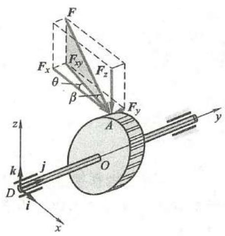 例1 图 2 所示的圆柱斜齿轮,其上受啮合力 \mathbf{F} 的作用。已知斜齿轮的齿倾角 (螺旋角 )\beta 和压力角 \theta ,求力 \mathbf{F} 在 x\text{、}y\text{、}z 轴上的投影。