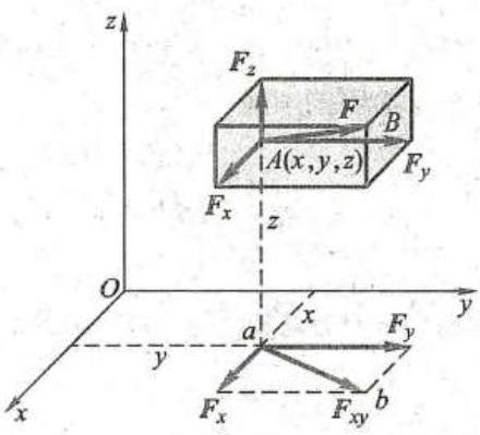 若以矩心 O 为原点,建立空间直角坐标系 {Oxyz} ,如图 4 所示,力作用点 A 的坐标为 A\left( {x, y, z}\right) ,力在三根坐标轴上的投影分别为 {F}_{x}\text{、}{F}_{y}\text{、}{F}_{z} ,则矢径 \mathbf{r} 和力 \mathbf{F} 可分别表示为