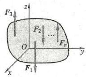 如图 22 所示,物体受一空间平行力系作用,设 z 轴与这些力平行,则各力对 z 轴的矩等于零。又由于 x 轴和 y 轴都与这些力垂直,各力在 x 轴和 y 轴上的投影也等于零。所以方程组 (27) 中, 第一、第二和第六个方程成了恒等式。因此, 空间平行力系只有 3 个平衡方程, 即