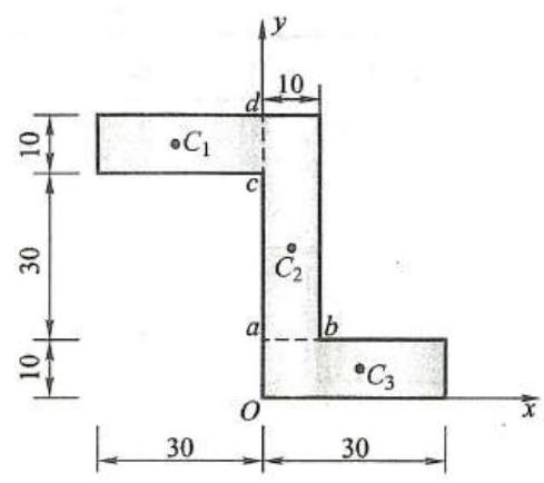 解: 用有限分割法,将该图形分割为三个矩形 (例如用 {ab} 和 {cd} 两线分割),则每个矩形的面积和其重心位置为已知,用式 (34) 计算即可。以 {C}_{1}\text{、}{C}_{2}\text{、}{C}_{3} 分别表示这三个矩形的重心,以 {A}_{1} 、 {A}_{2} 、 {A}_{3} 分别表示其面积,则三个矩形的面积和其重心 {C}_{1} 、 {C}_{2} 、 {C}_{3} 的坐标分别为