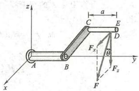 例 3 手柄 {ABCE} 位于平面 {Axy} 内,在 D 处作用一力 F ,它在垂直于 y 轴的平面内,偏离铅垂线的角度为 \theta ,如图 7 所示。 {CD} = a ,杆 {BC} 平行于 x 轴,杆 {CE} 平行于 y 轴, {AB} = {BC} = l ,求力 \mathbf{F} 对 x\text{、}y 、 z 轴的矩。