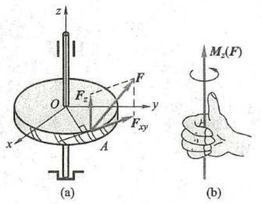 于是, 可得力对轴的矩的定义如下: 力对轴的矩是力使刚体绕该轴转动效果的度量, 是一个代数量, 其绝对值等于该力在垂直于该轴的平面上的投影对于这个平面与该轴的交点的矩的大小。其正负号规定为: 从 z -轴正端来看,若力使物体绕该轴逆时针转向取正号,反之则取负号。也可按右手螺旋法则确定其正负号,如图 5b 所示,拇指指向与 z 轴一致为正,反之为负。