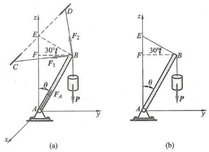 例 2 如图 3a 所示,用起重杆吊起重物,起重杆的 A 端用球铰链固定在地面上, B 端用两根等长绳 {CB} 和 {DB} 拉住,两绳分别系在墙上的点 C 和点 D ,连线 {CD} 平行于 x 轴。已知: {CE} = {EB} = {ED},\theta = {30}^{ \circ } ,物重 P = {10}\mathrm{{kN}} 。起重杆的重量不计, {CDB} 平面与水平面间的夹角 \angle {EBF} = {30}^{ \circ } (图 3b)。求起重杆和绳子所受的力。