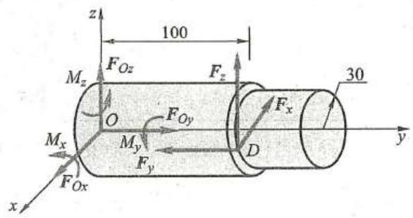 \sum {F}_{x} = 0,\;{F}_{Ox} - {F}_{x} = 0\sum {F}_{y} = 0,\;{F}_{Oy} - {F}_{y} = 0\sum {F}_{z} = 0,\;{F}_{Oz} + {F}_{z} = 0\sum {M}_{x} = 0,\;{M}_{x} + {100}\mathrm{\;{mm}} \cdot {F}_{z} = 0\sum {M}_{y} = 0,\;{M}_{y} - {30}\mathrm{\;{mm}} \cdot {F}_{z} = 0\sum {M}_{z} = 0,\;{M}_{z} + {100}\mathrm{\;{mm}} \cdot {F}_{x} - {30}\mathrm{\;{mm}} \cdot {F}_{y} = 0图 25