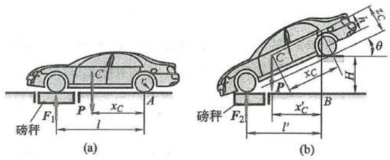 对于形状复杂、体积庞大的物体或由许多零部件构成的物体系, 常用称重法测定重心的位置。下面以汽车为例, 说明测定重心的称重法。