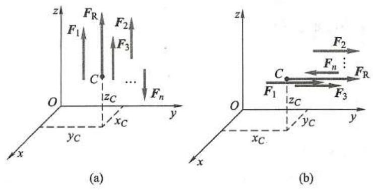 建立如图 28a 所示的坐标系,平行力系中各力的方向与 z 轴平行,设各力作用点的坐标分别为 \left( {{x}_{i},{y}_{i},{z}_{i}}\right) , i = 1,2,\cdots , n 。因为合力 {\mathbf{F}}_{\mathrm{R}} 与各力平行,所以合力 {\mathbf{F}}_{\mathrm{R}} 也与 z 轴平行,设其作用点为 C ,称之为平行力系中心。其坐标设为 \left( {{x}_{c},{y}_{c}}\right. , {z}_{c} ),此即为平行力系中心的坐标。根据合力矩定理,力系中各力对一点 (轴) 的力矩之和等于合力对同一点 (轴) 的矩, 因此合力对三根坐标轴的矩等于各力对三根坐标轴的力矩之和。分别对 x 轴和 y 轴应用合力矩定理,有