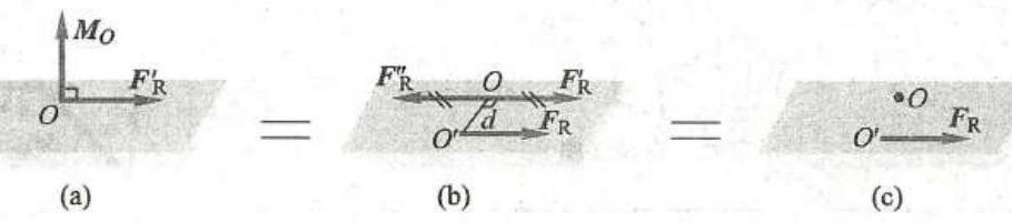 根据矢积的几何意义可知,主矩 {M}_{0} 垂直于单位矢量 \mathbf{a} ,亦即主矩 {M}_{0} 垂直于主矢 {\mathbf{F}}_{\mathrm{R}}^{\prime } ,如图 27 所示。这表明该力系还可以向另外一点继续简化得到一个合力 {\mathbf{F}}_{\mathrm{R}} 。前提是主矢 {\mathbf{F}}_{\mathrm{R}}^{\prime } 不等于零。因此可以得出结论: 如果空间平行力系的主矢不等于零, 则该力系一定可以简化得到一个合力。合力到当前简化中心 O 的距离为