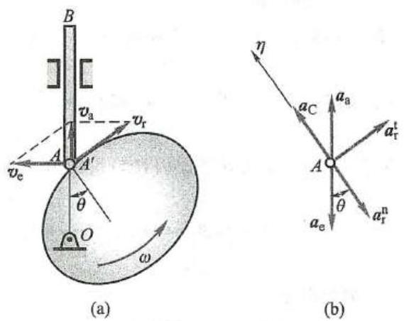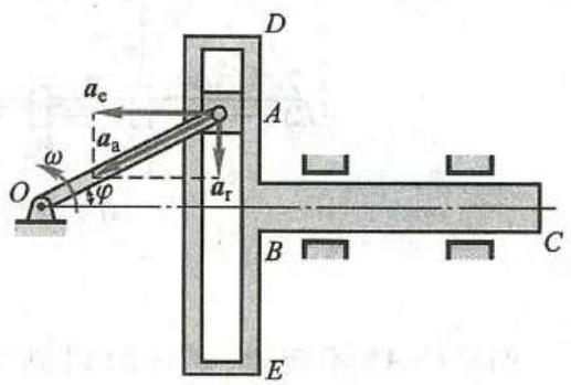 选取曲柄 {OA} 端 A 作为研究的动点,动参考系固定在丁字形杆 {BC} 上,于是动参考系做平移,可以应用点的加速度合成定理式 (26)。