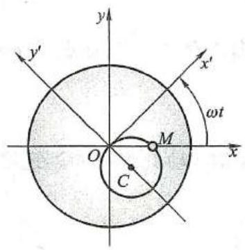 {x}^{\prime } = O{O}_{1} - {O}_{1}M \cdot \cos \psi = r\left( {1 - \cos \frac{vt}{r}}\right){y}^{\prime } = {O}_{1}M \cdot \sin \psi = r\sin \frac{vt}{r}牵连运动方程为