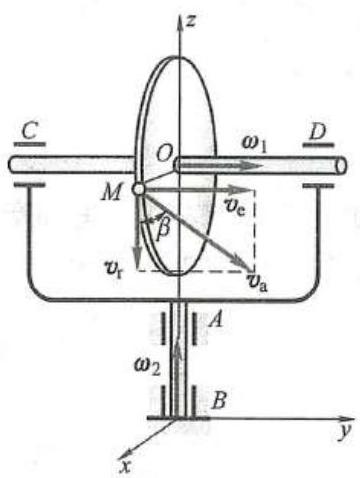 取圆盘上的点 1 为动点动参考系与框架固结则动参考系绕 {AB} 轴转动。应用点的加速度合成定理,有