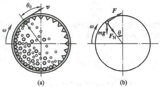 n = {9.549}\sqrt{\frac{g}{R}\cos {\theta }_{0}}显然,{\theta }_{0} 越小,要求 n 越大。当 n = {9.549}\sqrt{\frac{g}{R}} 时,{\theta }_{0} = 0 ,铁球就会紧贴筒壁转过最高点而不脱离筒壁落下,起不到粉碎矿石的作用。