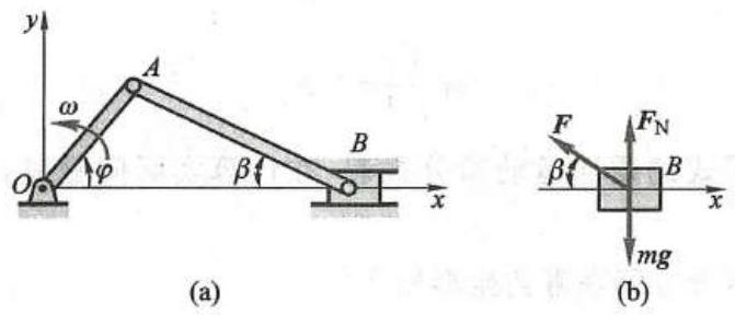 解: 以滑块 B 为研究对象,当 \varphi = {\omega t} 时,受力如图 2b 所示。由于不计连杆 {AB} 质量,连杆 {AB} 应受平衡力系作用,则连杆 {AB} 为二力杆,它对滑块 B 的力 F 沿 {AB} 方向。写出滑块 B 沿 x 轴的运动微分方程为