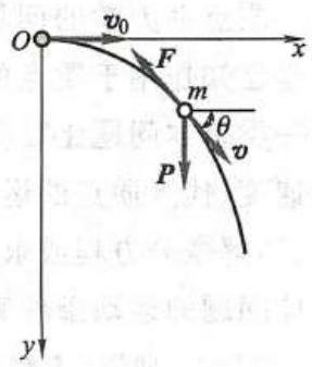 式(h)是非线性的微分方程组,只能求数值解。非线性问题不仅方程复杂,而且通常只能求数值解。现在完全可以利用计算机对各类非线性问题求数值解,对本题有兴趣的读者可以去进行数值求解。从式 (h) 还可以看到,这一非线性问题的水平和铅垂运动不是独立的,它们通过速度 v 互相影响,这与线性问题有本质的不同。