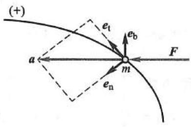 式中,{F}_{it}\text{、}{F}_{in} 和 {F}_{ib} 分别是作用于质点的各力在切线、主法线和副法线上的投影,而 \rho 为轨迹的曲率半径。