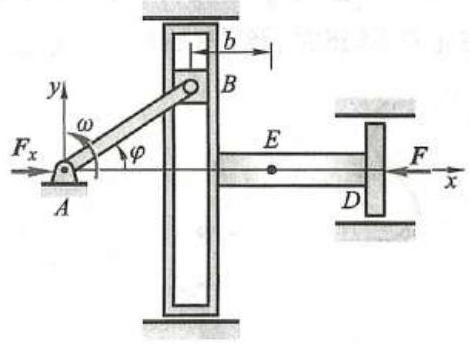 例 5 均质曲柄 {AB} 长为 r ,质量为 {m}_{1} ,初始位于水平位置,假设受力偶作用以不变的角速度 \omega 转动,并带动滑槽、连杆及与连杆固连的活塞 D ,如图 9 所示。滑槽、连杆、活塞总质量为 {m}_{2} ,质心在点 E 。在活塞上作用一恒力 F 。不计摩擦及滑块 B 的质量,求作用在曲柄 {AB} 轴 A 处的最大水平约束力 {\mathbf{F}}_{x} 。