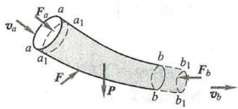 p - {p}_{0} = {q}_{V}\rho \mathrm{d}t\left( {{v}_{b} - {v}_{a}}\right)作用于质点系上的外力包括:均匀分布于体积 {aabb} 内的重力 \mathbf{P} ,管壁对于此质点系的作用力 \mathbf{F} ,以及两截面 {aa} 和 {bb} 上受到的相邻流体的压力 {\mathbf{F}}_{a} 和 {\mathbf{F}}_{b} 。