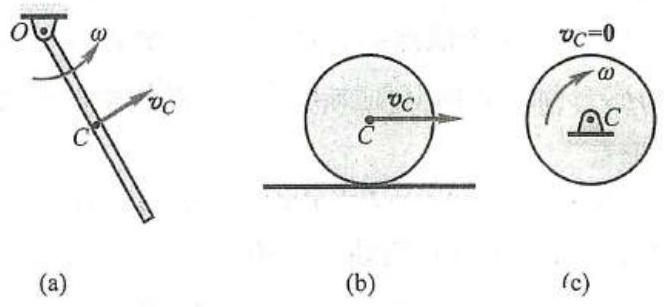 刚体是由无限多个质点组成的不变质点系,质心是刚体内某一确定点 (这一点也可能在刚体外部)。对于质量均匀分布的规则刚体,质心就是几何中心,用式 (3)计算刚体的动量是非常方便的。例如,长为 l 、质量为 m 的均质细杆,在平面内绕点 O 转动,角速度为 \omega ,如图 1a 所示。细杆质心的速度 {v}_{c} = \frac{l}{2}\omega ,则细杆的动量大小为 m\frac{l}{2}\omega ,方向与 {v}_{c} 相同。又如图1b所示的均质滚轮,质量为 m ,轮心速度为 {v}_{c} ,则其动量为 m{v}_{c} 。而如图1c所示的绕中心转动的均质轮,无论有多大的角速度和质量,由于其质心不动,其动量总是零。