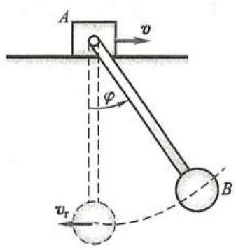 例 3 物块 A 可沿光滑水平面自由滑动,其质量为 {m}_{A} ;小球 B 的质量为 {m}_{B} ,以细杆与物块铰接,如图 5 所示。设细杆长为 l ,质量不计,初始时系统静止,并有初始摆角 {\varphi }_{0} ,释放后,细杆近似以 \varphi = {\varphi }_{0}\cos {\omega t} 规律摆动 ( \omega 为已知常数),求物块 A 的最大速度。