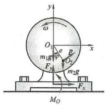 例 1 电机的外壳固定在水平基础上,定子和机壳的总质量为 {m}_{1} ,转子质量为 {m}_{2} ,如图 2 所示。设定子的质心位于转轴的中心 {O}_{1} ,但由于制造误差,转子的质心 {O}_{2} 到 {O}_{1} 的距离为 e 。已知转子匀速转动,角速度为 \omega 。求基础的水平及铅垂约束力。