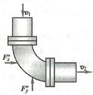 {F}_{x}^{\prime \prime } = {q}_{v}\rho \left( {{v}_{2} - 0}\right) = \rho {A}_{2}{v}_{2}^{2},\;{F}_{y}^{\prime \prime } = {q}_{v}\rho \left( {0 + {v}_{1}}\right) = \rho {A}_{1}{v}_{1}^{2}由此可见,当流速很高或管子截面面积很大时,附加动约束力很大,在管子的弯头处应该安装支座。