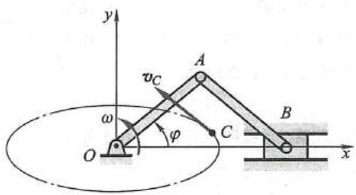 解: 建立如图所示直角坐标系 {Oxy} ,设 t = 0 时,杆 {OA} 水平,则有 \varphi = {\omega t} 。由式 (13) 得质心 C 的坐标为