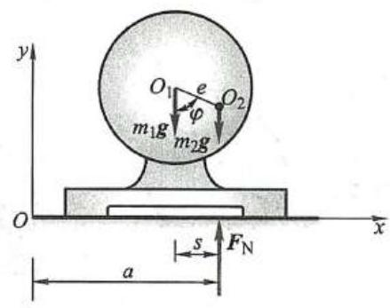 取坐标系如图所示。转子在静止时其质心 {O}_{2} 在最低点,设 {x}_{C1} = a 。当转子转过角度 \varphi 时,定子应向左移动,设移动距离为 s ,则质心坐标为