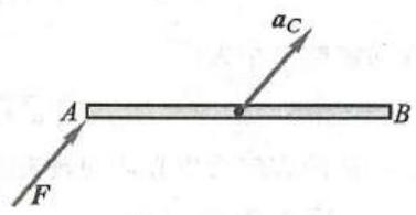 例如,在图 8 中,均质杆 {AB} 仅在 A 端受力 \mathbf{F} 作用,但 {\mathbf{a}}_{A} \neq \mathbf{F}/m ,这是由于杆 {AB} 不是质量集中于点 A 的质点,因此不能应用质点动力学的基本方程。由质心运动定理可以确定杆 {AB} 的质心点 C 的加速度 {a}_{c} = F/m 。尽管力 F 作用于点 A ,但可直接得到点 C 的加速度。