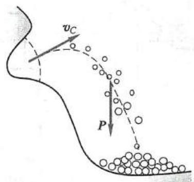 例如在爆破山石时,土石碎块向各处飞落,如图 7 所示。在尚无碎石落地前,全部土石碎块的质心运动与一个抛射质点的运动一样,设想这个质点的质量等于质点系的全部质量,作用在这个质点上的力是质点系中各质点重力的总和。根据质心的运动轨迹,可以在定向爆破时,预先估计大部分土石块堆落的地方。