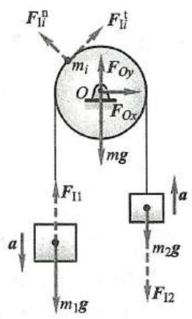 记定滑轮边缘上任一点 i 的质量为 {m}_{i} ,加速度有切向、法向加速度,加惯性力如图所示,大小分别为