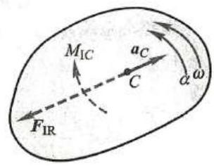 结论:有质量对称平面的刚体,平行于此平面运动时,刚体的惯性力系简化为在此平面内的一个力和一个力偶。这个力通过质心,其大小等于刚体的质量与质心加速度的乘积,其方向与质心加速度的方向相反;这个力偶的力偶矩等于刚体对过质心且垂直于质量对称平面的轴的转动惯量与角加速度的乘积,转向与角加速度相反。