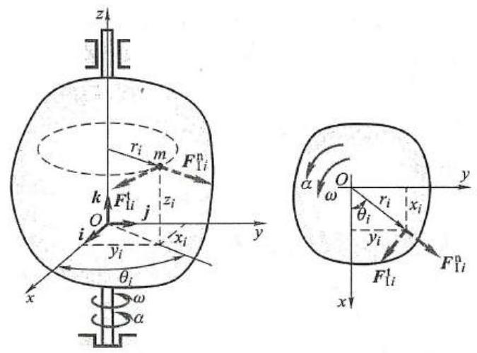 在日常生活和工程实际中,有大量绕定轴转动的刚体 (电动机、柴油机、电风扇、车床主轴等),如何使这些机械在转动时不产生破坏、振动与噪声,是工程师非常关心的问题。如果这些机械在转动起来之后轴承受力与不转时轴承受力一样,则一般说来这些机械不会产生破坏,也不会产生振动与噪声。由前面已知静约束力与动约束力的概念,对绕定轴转动的刚体,如果能够消除轴承附加动约束力,使轴承只受到静约束力作用,就可以做到这一点。为此,先把任意一个绕定轴转动刚体的轴承全约束力(包括静约束力与附加动约束力)求出来,然后再推出消除附加动约束力的条件。