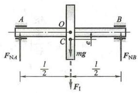 {F}_{\mathrm{N}A} = {F}_{\mathrm{N}B} = \frac{1}{2}\left( {{mg} + {F}_{I}^{\mathrm{n}}}\right) = \frac{1}{2} \times \left( {{20} \times {9.8} + {3160}}\right) \mathrm{N} = {1678}\mathrm{\;N}其中轴承附加动约束力为 \frac{1}{2}{F}_{I}^{n} = {1580}\mathrm{\;N} 。由此可见,在高速转动下,{0.1}\mathrm{\;{mm}} 的偏心距所引起的轴承附加动约束力,可达静约束力 \left( {\frac{1}{2}{mg} = {98}\mathrm{\;N}}\right) 的 16 倍之多! 而且转速越高,偏心距越大,轴承附加动约束力越大,这势必会加快轴承磨损,甚至引起轴承的破坏。