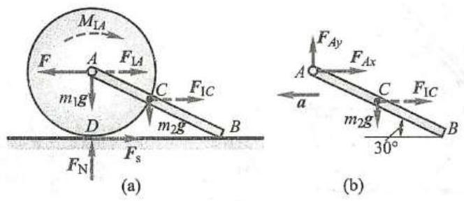 \sum {M}_{C} = 0,\left( {{m}_{2}g + {F}_{1}}\right) r - {Fr} + {M}_{I} = 0\sum {F}_{x} = 0,F\cos \theta - {F}_{BC}\cos \theta - {F}_{AC} = 0\sum {F}_{y} = 0,{F}_{BC}\sin \theta - F\sin \theta - \left( {{m}_{1} + {m}_{2}}\right) g - {F}_{I} = 0解得