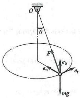 例1 用达朗贝尔原理求解:一圆锥摆,质量 m = {0.1}\mathrm{\;{kg}} 的小球系于长 l = {0.3}\mathrm{\;m} 的绳上,绳的另一端系在固定点 O ,并与铅垂线成 \theta = {60}^{ \circ } 角。如小球在水平面内做匀速圆周运动,求小球的速度 v 与绳的张力的大小。