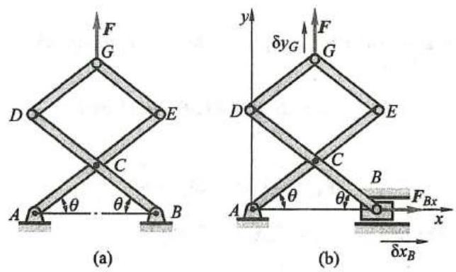 {F}_{Bx} = \frac{3}{2}F\cot \theta此题如果在点 C\text{、}G 之间连接一自重不计、刚度系数为 k 的弹簧,如图 12a 所示。在图示位置弹簧已有伸长量 {\delta }_{0},其他条件不变,仍求支座 B 的水平约束力。则仍需解除 B 处水平方向约束,去掉弹簧,均代之以力,如图 12b 所示。在图示位置,弹簧有伸长量 {\delta }_{0},所以弹性力 {F}_{C} = {F}_{G} = k{\delta }_{0} 。仍用解析法,列虚功方程,有