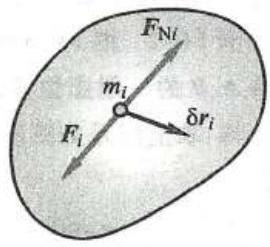 若给质点系以某种虚位移,其中质点 {m}_{i} 的虚位移为 \delta {\mathbf{r}}_{i},则作用在质点 {m}_{i} 上的力 {\mathbf{F}}_{i} 和 {\mathbf{F}}_{\mathrm{N}i} 的虚功的和为