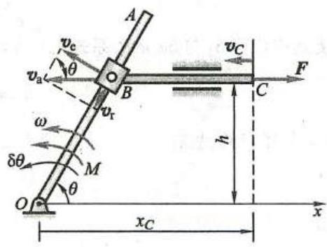 其中, {\delta \theta } 为质点系虚位移所引起角度 \theta 的微小变化, 可看成是广义的 “虚位移”;\delta {x}_{c} 为点 C 沿 x 轴正向的虚位移分量。 {\delta \theta } 与 \delta {x}_{c} 之间的关系可采用虚速度法求得。如图 10 所示,取套筒 B 为动点,杆 {OA} 为动参考系, 则由点的速度合成公式, 得
