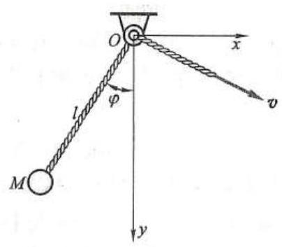图 5 中重物 M 由一根穿过固定圆环 O 的细绳系住。设摆长在开始时为 {l}_{0},然后以不变的速度 v 拉动细绳的另一端,此时单摆的约束方程为